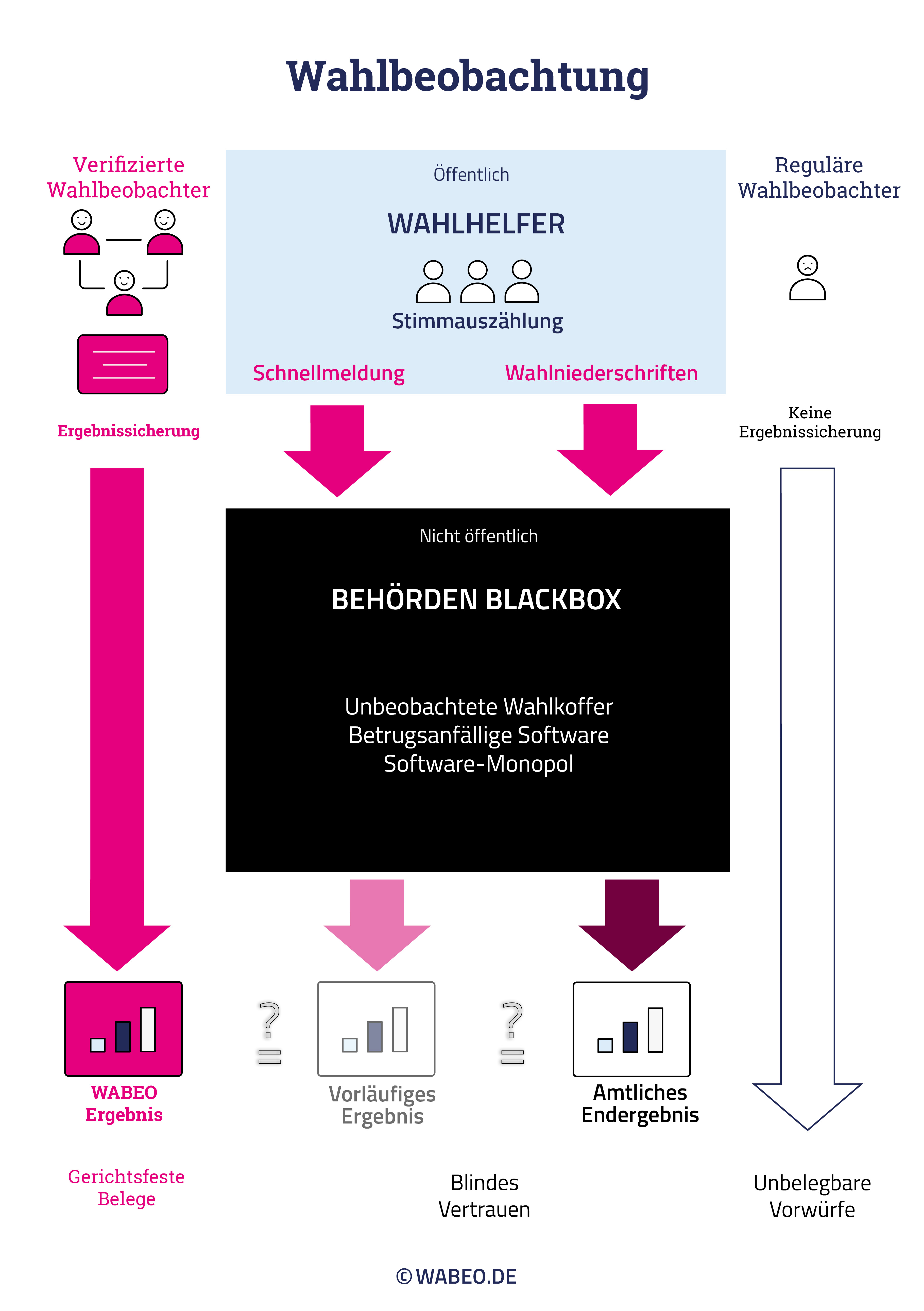 Hier ein Schaubild zur Veranschaulichung des Unterschiedes zwischen verifizierter und nicht-verifizierter, also dem gewöhnlichen Hingehen als Wahlbeobachter und mal Schauen, wie es im Wahllokal so läuft, und verifizierten, flächendeckenden und gerichtsfesten Endergebnissen.